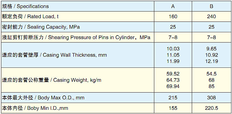 DPX-D型悬挂器为双锥、双排卡瓦、双液缸结构,具有双保险坐挂功能。投球后,高压液体推动卡瓦上行。 特 点 1. 液压控制实施坐挂,可用于不同井眼条件。 2. 具有两套不同结构的坐挂机构,成功率更高。 3. 与SQ型送球器配套使用,可用于水平井、大斜度井尾管固井。 4. 密封件采用丁腈/氟橡胶,耐温可达120℃/200℃。 5. 液缸、本体等主要零件均选用高强度的合金结构钢,可保证其力学性能。 规 格 A:φ244.5mm×φ177.8mm/φ139.7mm B:φ339.7mm×φ244.5mm 技术参数